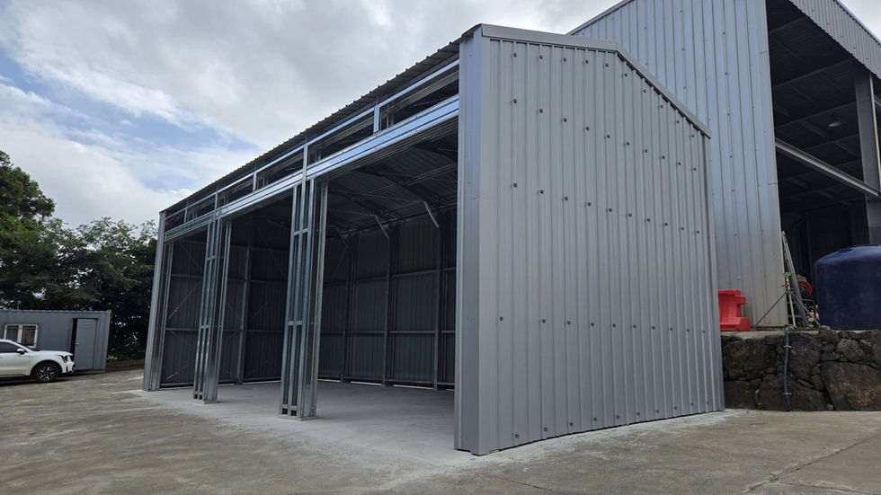 특기사항 : 기존 마당에 기초두께만 보강하여 다시 타설후 바로 골조및 강판공사를 시행하였습니다. 때문에 바닥 레벨 편차가 상당하여 현장방문후 각 기둥위치를 실측한 후 그에 맞게 각각 제작하여 시공하였습니다. 가설건축물로 폐기물 반출까지 임시창고로 사용예정이기에, 장비 작업의 편의를 위하여 전부 기둥간격을 넓혀 보강하여 시공하여습니다.